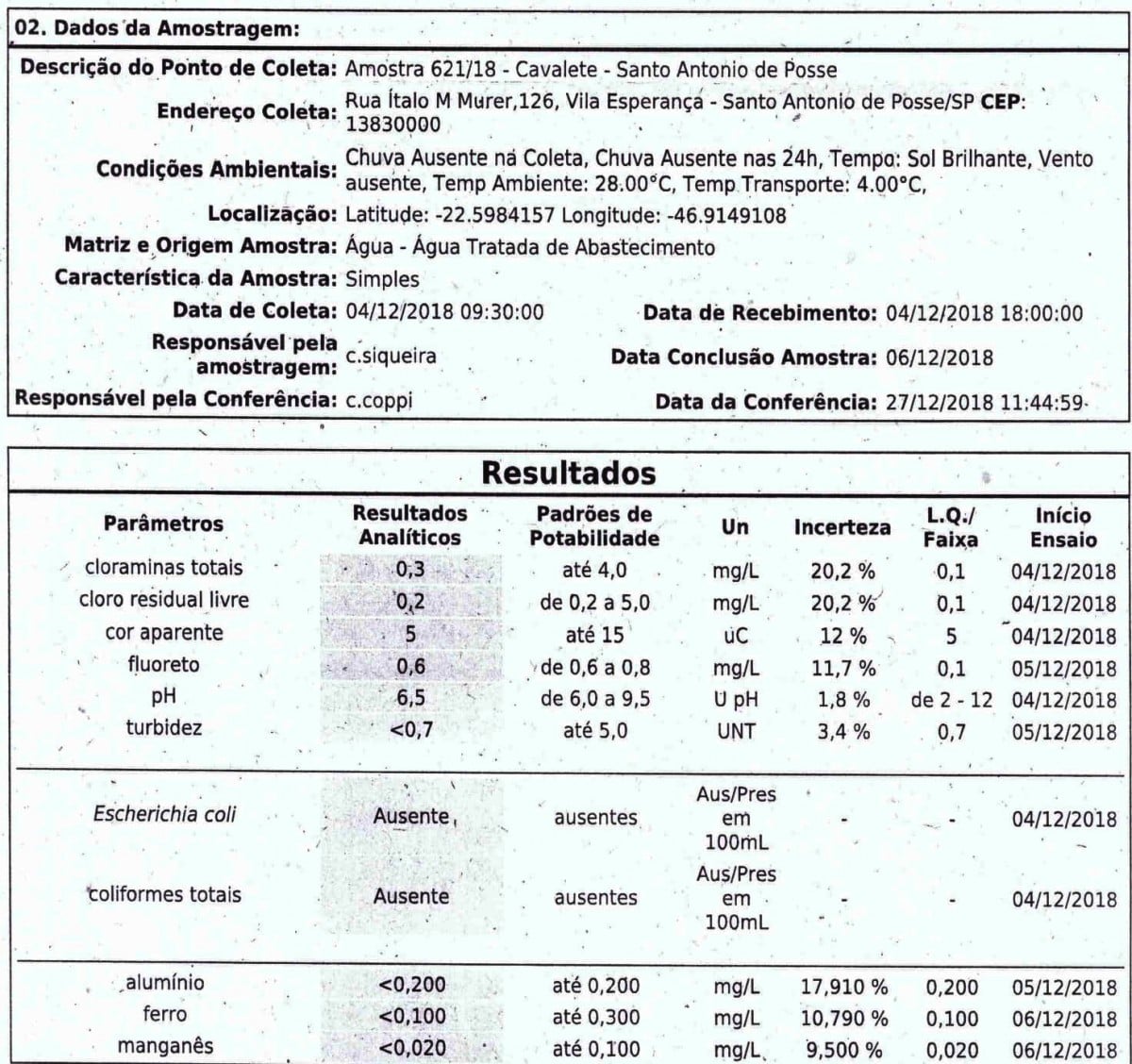 A última coleta de amostras, captadas diretamente de pontos de recebimento e de diferentes locais do município, comprovou a qualidade da água distribuída aos possenses, através dos Relatório de Ensaio nº 12635, de 4 de dezembro de 2018.
