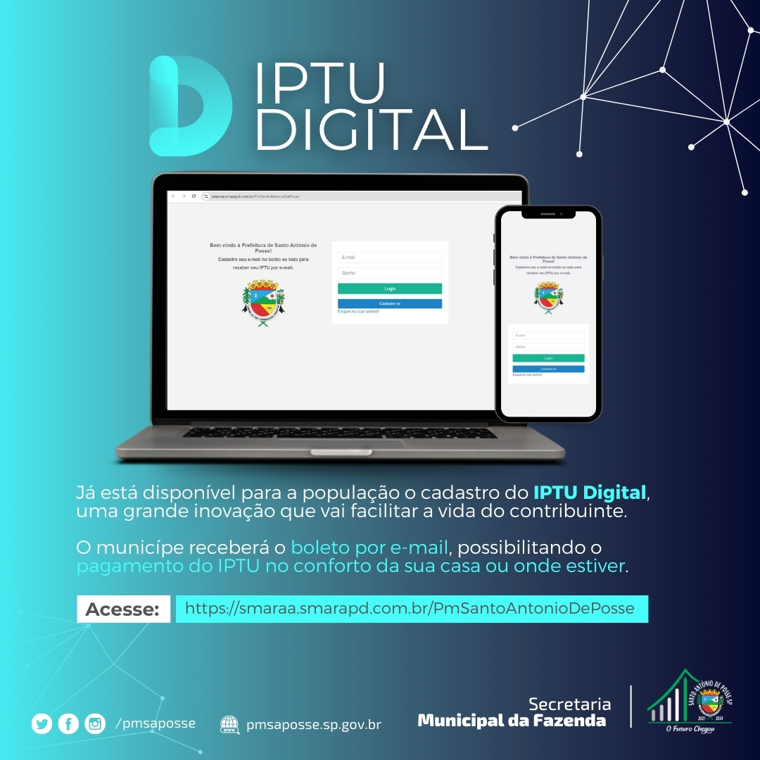 Agora os moradores de Santo Antônio de Posse podem optar por receber o Imposto Predial Territorial Urbano, de forma online, por meio da plataforma "IPTU Digital", uma grande inovação que vai facilitar a vida do contribuinte. A partir do cadastro,...