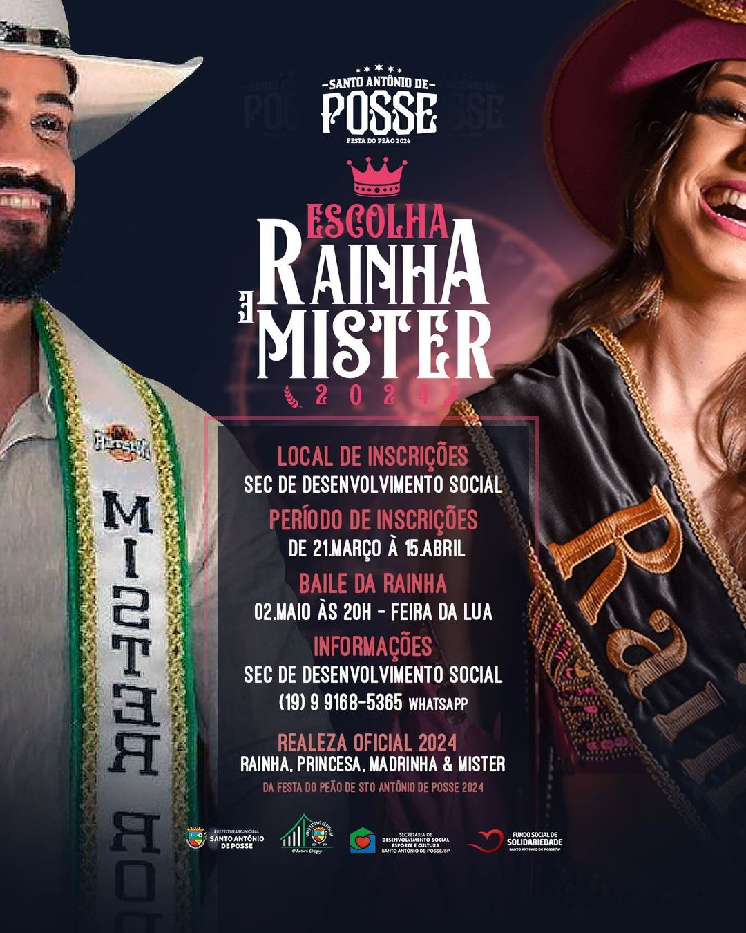 Estão abertas as inscrições para a escolha da Rainha, Princesa Madrinha e Mister da Festa do Peão 2024 de Santo Antônio de Posse. As(os) interessadas(os) devem procurar a Secretaria de Desenvolvimento Social, localizada na Rua Santo Antônio, 38...