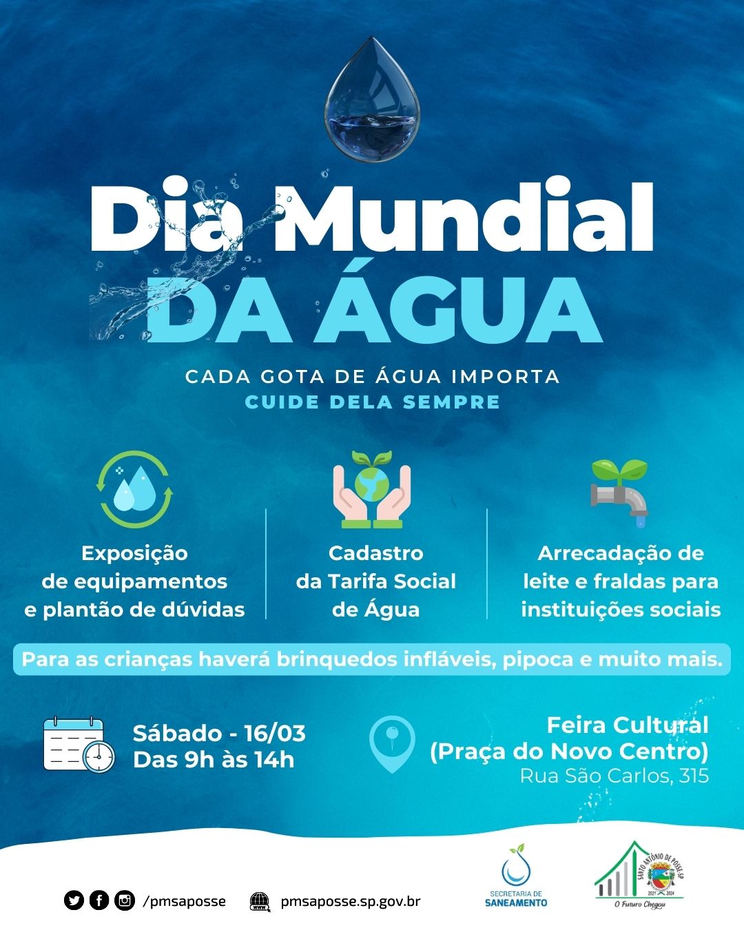 Em celebração ao Dia Mundial da Água, a Prefeitura Municipal, por meio da Secretaria de Saneamento, promove no sábado, 16 de março, uma ação ambiental na Feira Cultural, localizada na Praça do Novo Centro, próxima à Caixa Econômica Federal...