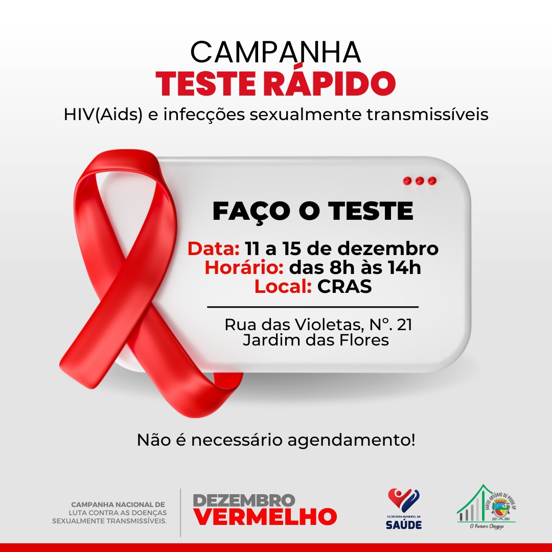 Neste mês de dezembro, dedicado a luta contra o vírus HIV, a Aids e outras IST (infecções sexualmente transmissíveis), a Prefeitura Municipal, por meio da Secretaria da Saúde, promove entre os dias 11 e 15 de dezembro, a campanha de teste rápi...