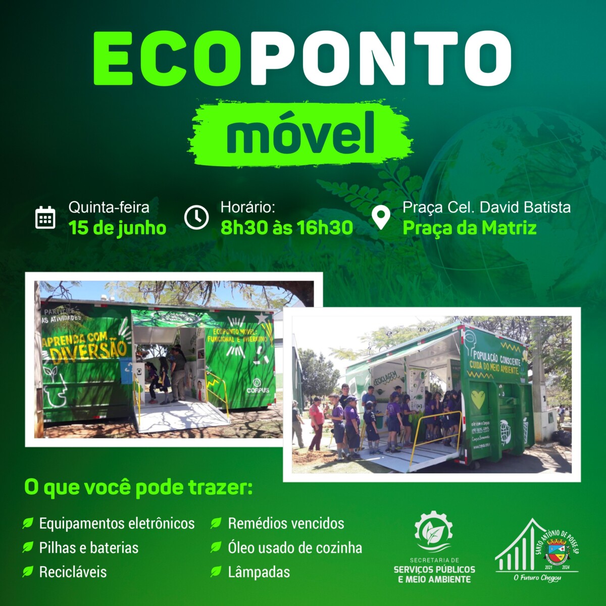 O Ecoponto móvel, moderna ferramenta de educação ambiental para crianças, jovens e adultos, será instalado na quinta-feira, 15 de junho, na Praça Cel. David Batista (Praça da Matriz). O contêiner interativo ficará aberto para visitação das...