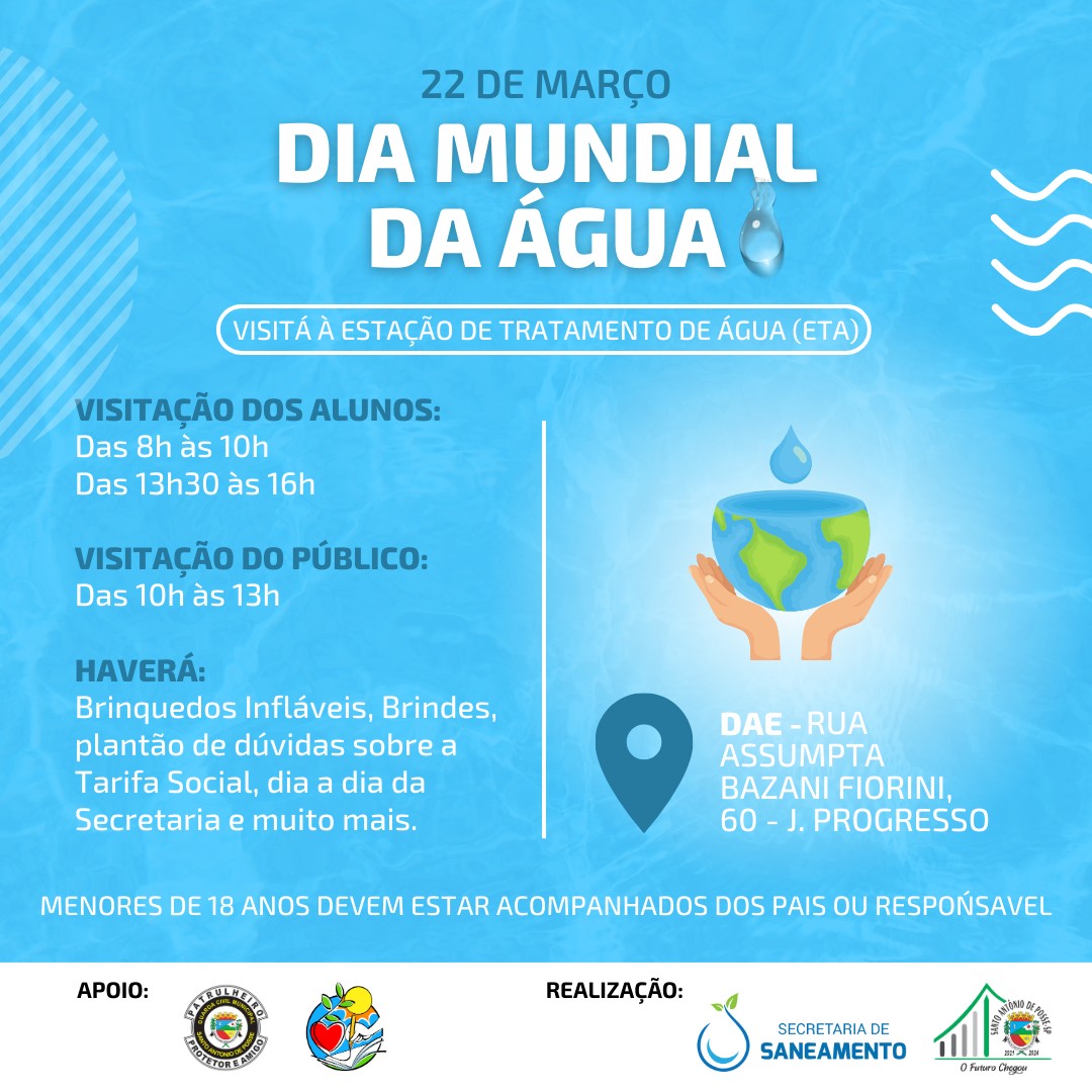 Para celebrar o Dia Internacional da Água, comemorado em 22 de março, a Prefeitura Municipal, por meio da Secretaria de Saneamento, realiza nesta quarta-feira (22), diversas atividades na Estação de Tratamento de Água (ETA). A iniciativa é dest...