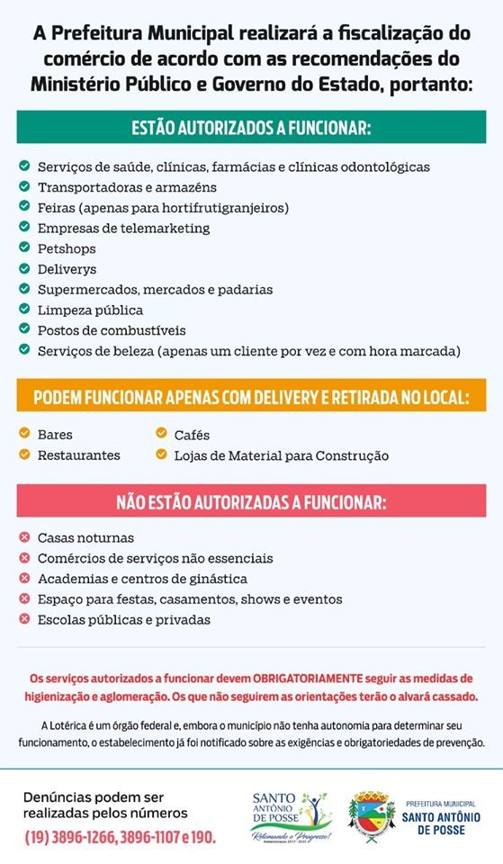 A Prefeitura Municipal de Santo Antônio de Posse publicou na segunda-feira, dia 20 de abril, o decreto nº 3.500 que prorroga até 10 de maio a quarentena em todo o município e obriga o isolamento social, além de restringir o funcionamento do com...