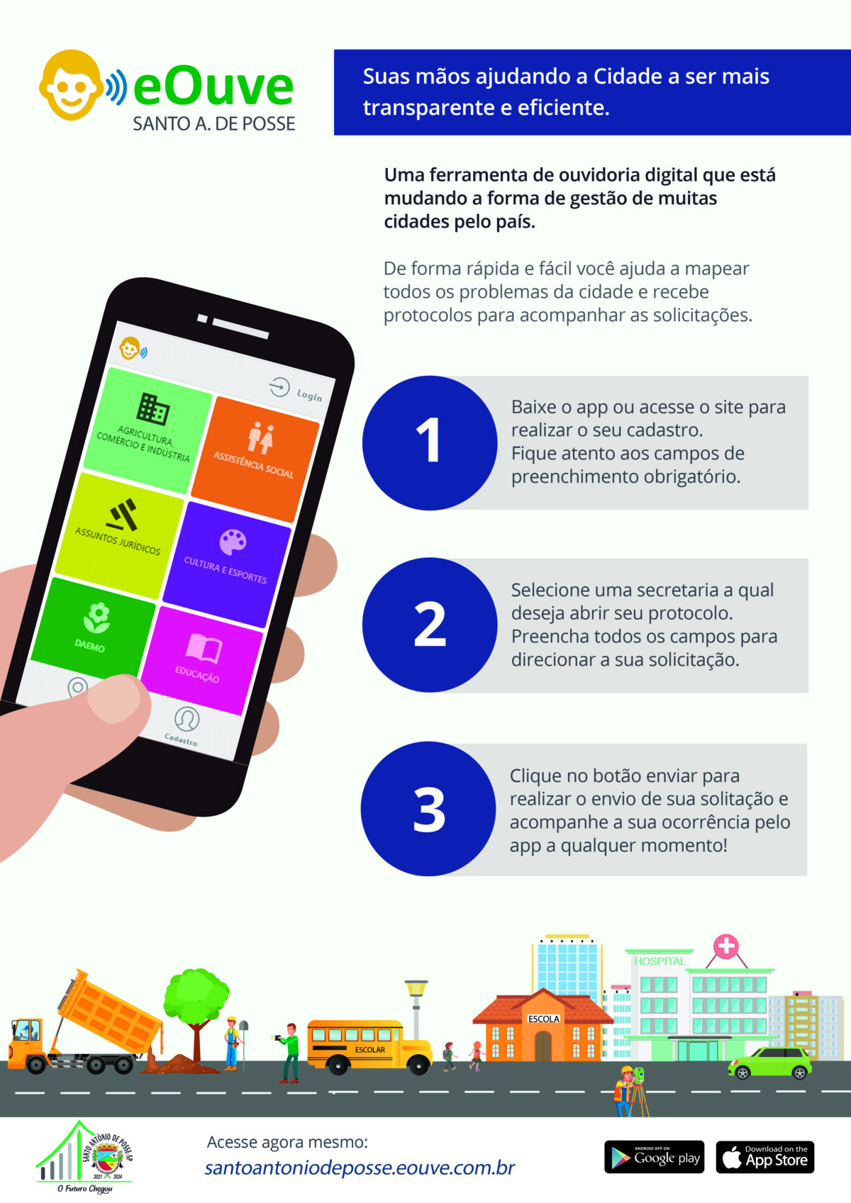 Com o eOuve, os munícipes poderão acessar serviços de várias secretarias e manter contato on-line, usando celular, tablet ou computador. Após baixar o aplicativo, será solicitada a indicação do estado e da cidade e o usuário deve clicar em São Paulo e depois em Santo Antônio de Posse. A partir daí, um cadastro simples identifica o cidadão. Todas as secretarias de Santo Antônio de Posse estarão relacionadas no aplicativo e os serviços disponíveis também.