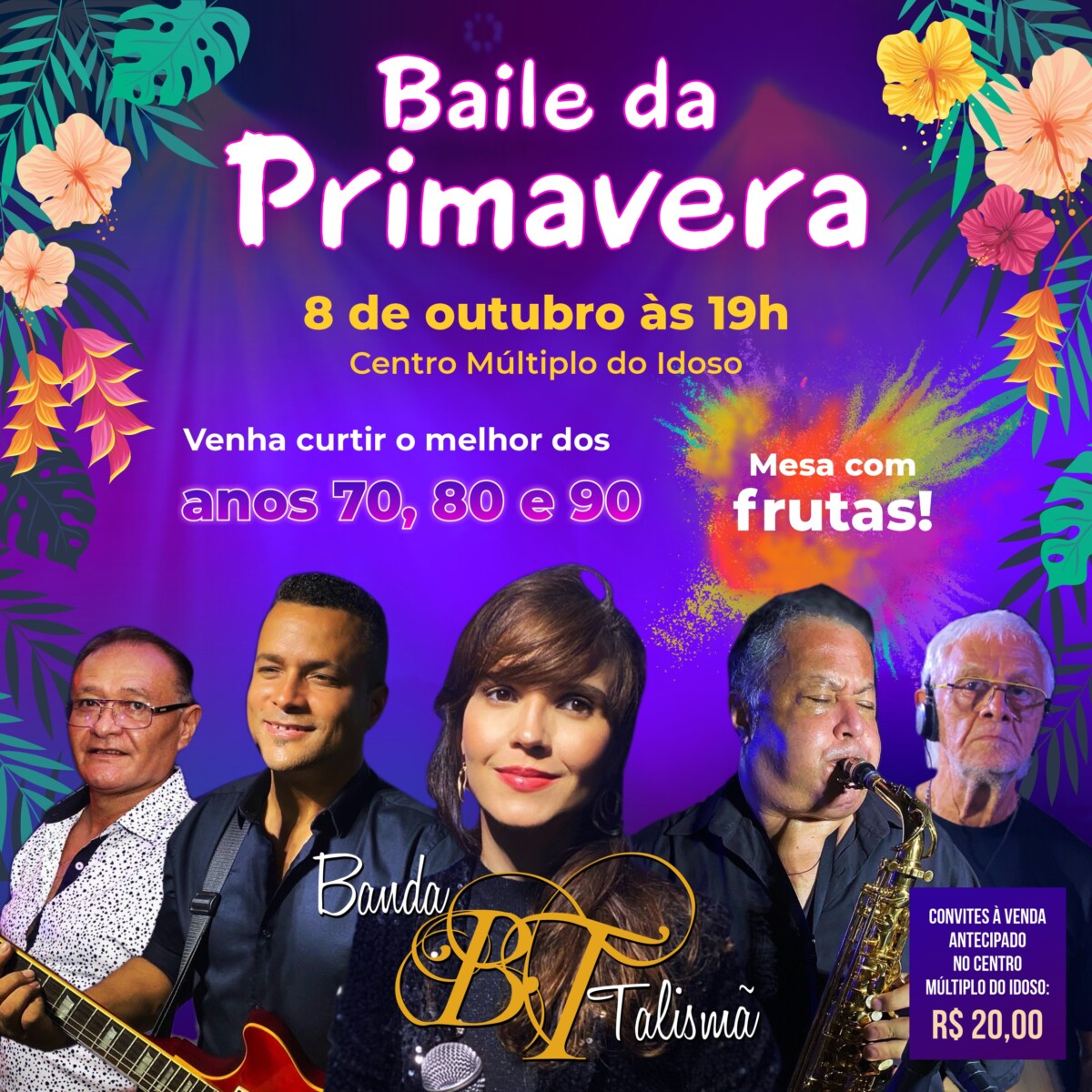 A Secretaria de Desenvolvimento Social e o Fundo Social de Solidariedade, convidam todos e todas para mais uma noite de festa e muita diversão, o Baile de Primavera, com apresentação da Banda Talismã.