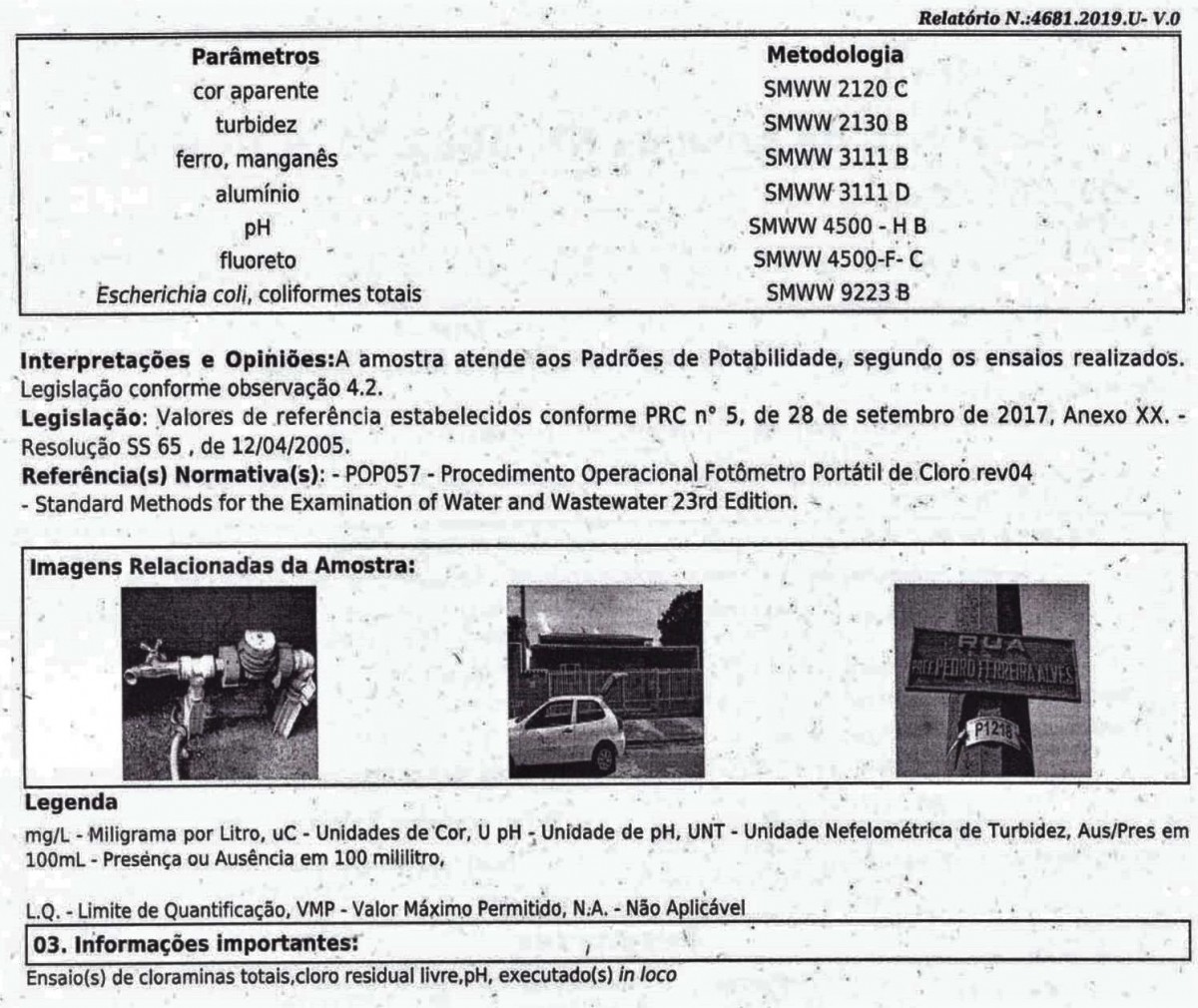 Através do Relatório de Ensaio nº 4681.2019, comprovou-se a qualidade da água tratada em Santo Antônio de Posse, conforme imagens abaixo: