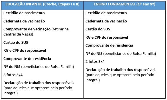 Os pais interessados em matricular seus filhos na rede municipal de ensino, devem comparecer no prédio Central de Vagas de segunda a sexta-feira, das 8h às 17h, com os seguintes documentos: