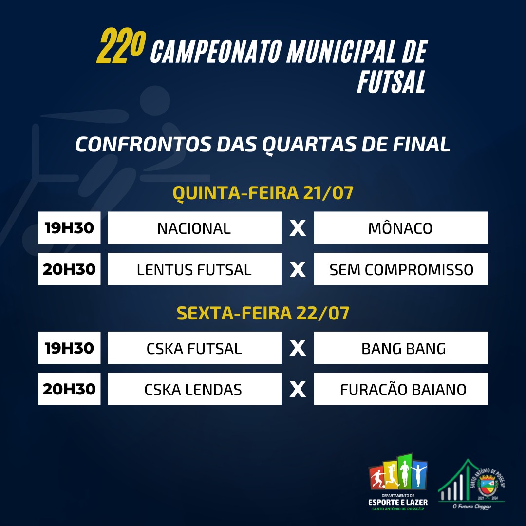 As quartas de final do 22º Campeonato Municipal de Futsal Masculino foram definidas após a última rodada da fase de grupos. Abrindo o mata-mata, na quinta-feira, 21, às 19h30, o Nacional, primeiro colocado do Grupo A, enfrenta o Mônaco, quarto classificado pelo Grupo B. O segundo confronto do dia acontece entre Lentus Futsal, segundo colocado do Grupo A, contra o Sem Compromisso, terceiro colocado do Grupo B.
