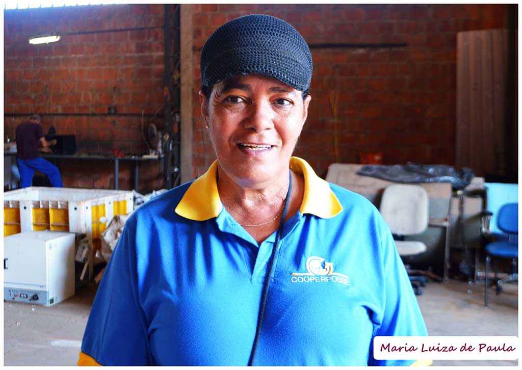 Maria Luiza de Paula, conhecida por todos como Luiza, a atual presidente da Cooperposse se dedica a profissão de recicladora há 12 anos e está envolvida em todos os processos da cooperativa. Guerreira, é a personificação da mulher que mostra a todos que força e a leveza andam lado a lado. Mãe de Daiane, Daniel e Débora e há 24 anos dividindo a vida com seu companheiro Lorisval, Luiza é exemplo de esforço e determinação.