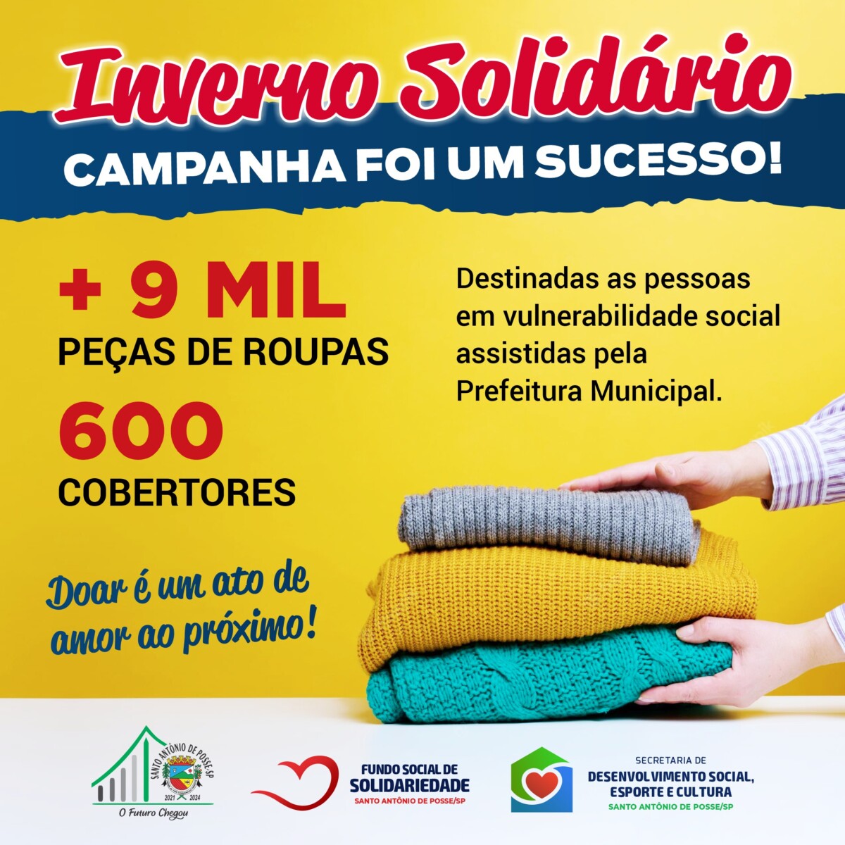 A campanha Inverno Solidário, promovida pelo Fundo Social de Solidariedade e pela Secretaria de Desenvolvimento Social, foi um grande sucesso, ao arrecadar 9 mil peças de roupas e 600 cobertores, sendo destinadas para as pessoas em situação de vulnerabilidade social e assistidas pela Prefeitura Municipal.
