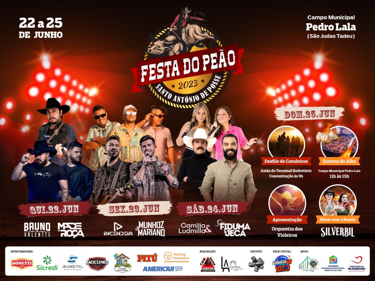 #FestadoPeão2023 O evento mais esperado de Santo Antônio de Posse já tem data marcada. De 22 a 25 de junho acontece a Festa do Peão 2023, com o melhor da música sertaneja, provas de montaria, desfile de cavaleiros, além da famosa Queima do Alho com a participação de comitivas de todo o Estado de São Paulo.