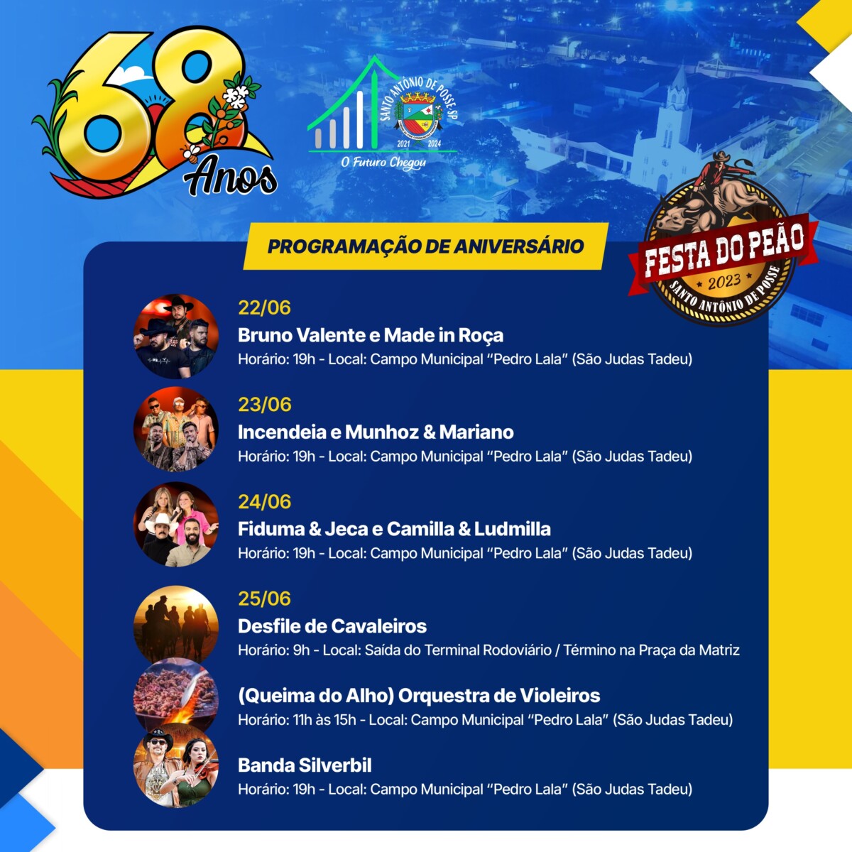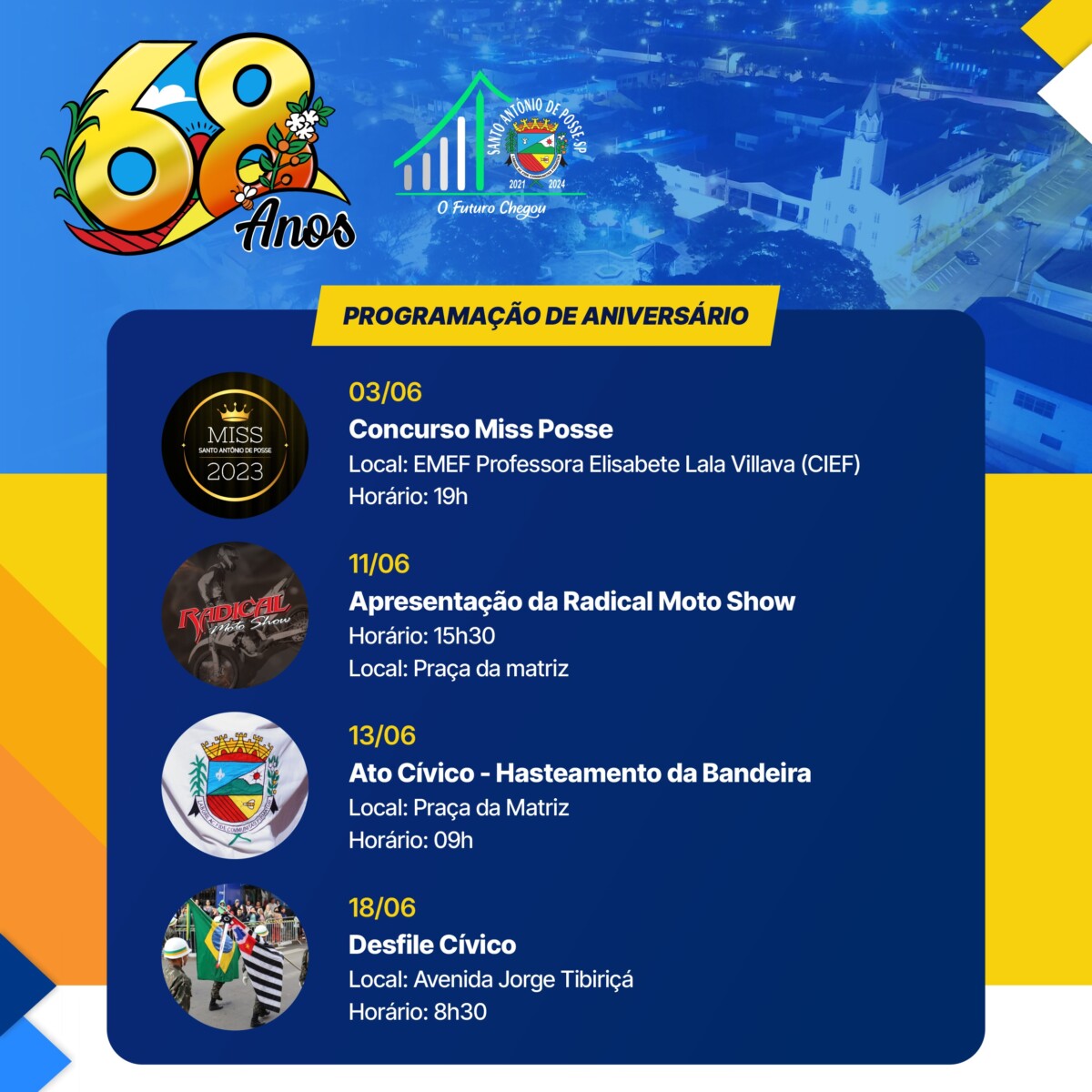 Preparados para a programação de aniversário de Santo Antônio de Posse? As comemorações têm início neste sábado, 3 de junho, na EMEF Professora Elisabete Lala Villava (CIEF), com o concurso Miss Posse 2023, a partir das 19h. No domingo, dia 11, o público poderá conferir um verdadeiro show de manobras radicais e números de tirar o fôlego com apresentação da equipe da Radical Moto Show, na Praça da Matriz, às 15h30. Já na terça-feira, 13, acontece também na Praça da Matriz, às 9h, a solenidade de hasteamento das bandeiras. O tradicional Desfile Cívico ocorre no domingo, 18, na Avenida Jorge Tibiriçá, com início às 8h30. Fechando a programação, entre os dias 22 e 25 de junho, a população pode se preparar para o melhor da música sertaneja, provas de montaria, desfile de cavaleiros, além da famosa Queima do Alho com a participação de comitivas de todo o Estado de São Paulo, com a Festa do Peão 2023.