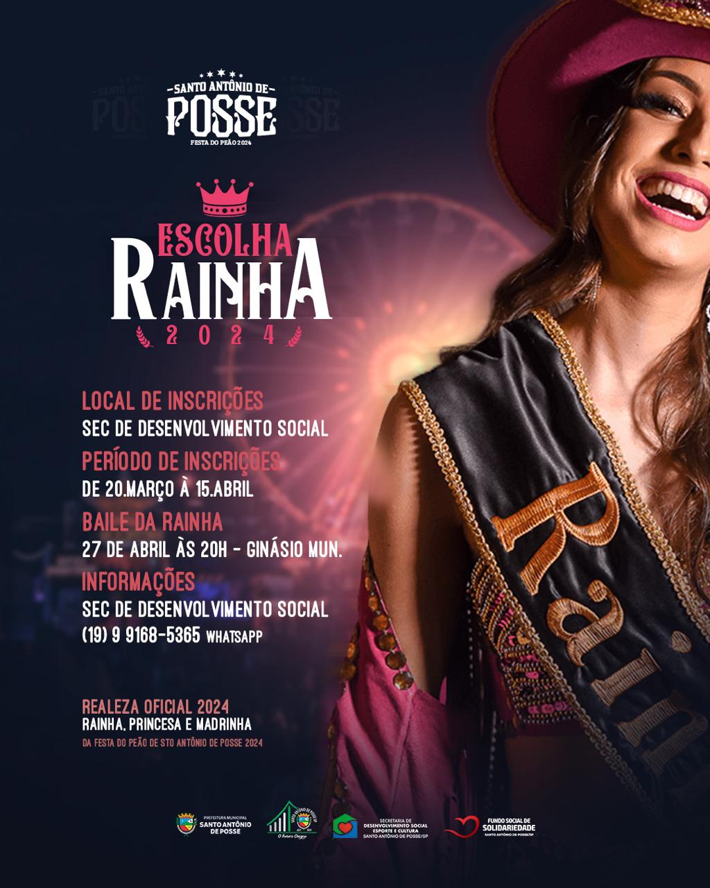 – Primeira fase: inscrições para concurso da rainha da Festa do Peão 2024 de Santo Antônio de Posse, de 21 de março a 15 de abril, por meio de preenchimento do formulário.