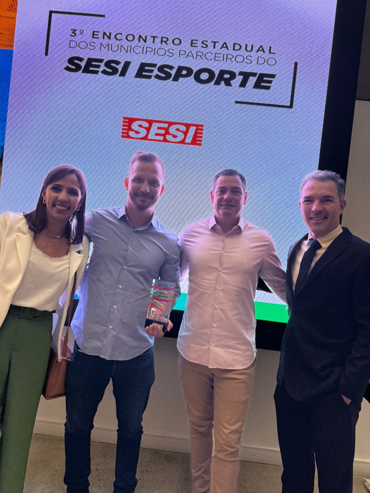 Santo Antônio de Posse foi homenageada nesta terça-feira, 14 de maio, durante o 3º Encontro Estadual dos Municípios Parceiros do SESI Esporte, realizado no Centro Cultural FIESP, em São Paulo. O evento reuniu representantes de mais de 150 cidades, e Santo Antônio de Posse foi representada pelo diretor do Departamento de Esportes e Lazer, Eduardo Suzigan de Campos e pelo secretário de Serviços Públicos e Meio Ambiente, Tiago Nizoli de Campos.