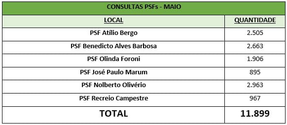 Em agosto, foram realizados 24.151 atendimentos, incluindo todos os serviços de saúde realizados nos PSFs, Unidade Integrada de Saúde (ambulatório), Centro de Reabilitação (fisioterapia, fonoaudiologia, terapia ocupacional), Centro Odontológico, Vigilância Epidemiológica, consultas no Pronto Socorro e consultas realizadas no CAPS.
