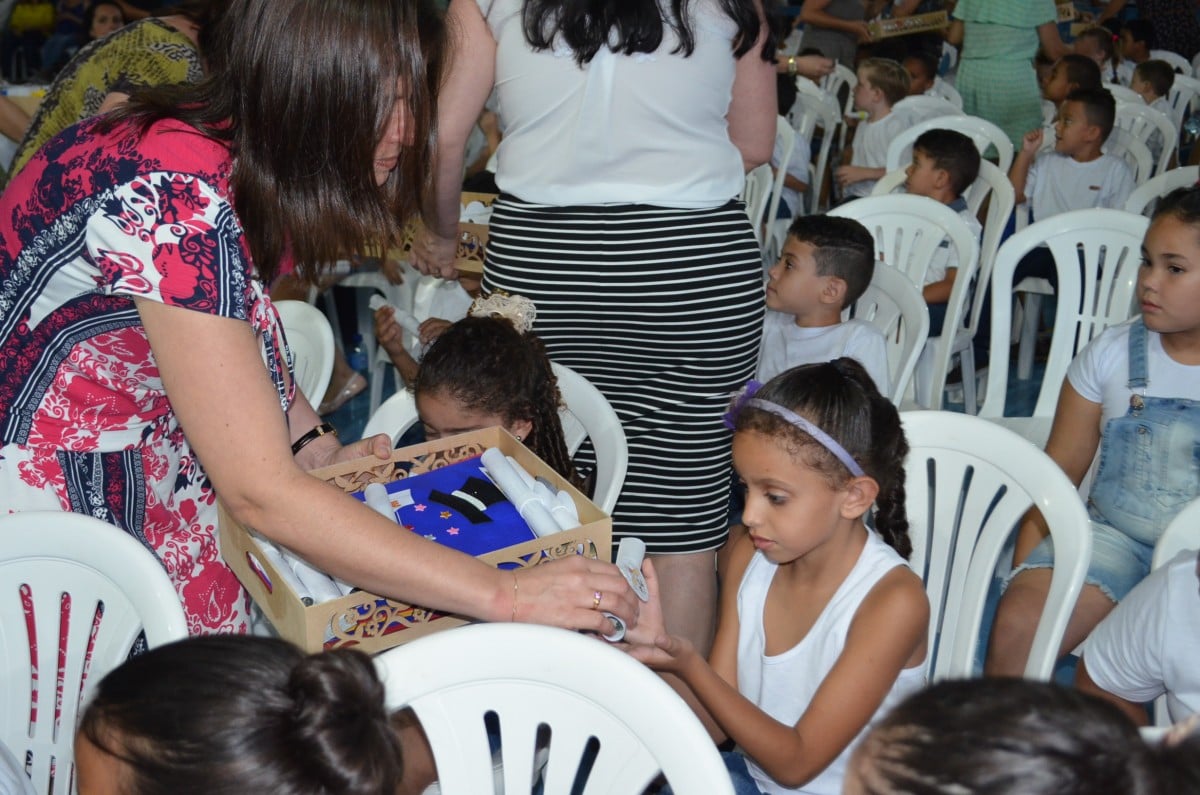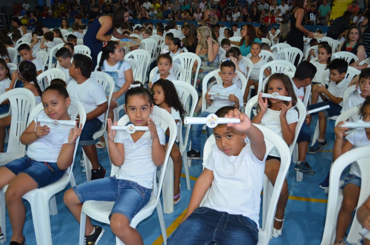 Nesta semana, os alunos das EMEFs comemoram com seus amigos e familiares o término da primeira etapa de vida educacional. Ao todo, seis Creches e uma EMEI realizaram a entrega do certificado aos seus estudantes. As cerimônias aconteceram na quadra poliesportiva da EMEF Profª. Elisabete Lala Villalva (CIEF) e no prédio da EMEI Primeira Estação, respectivamente.