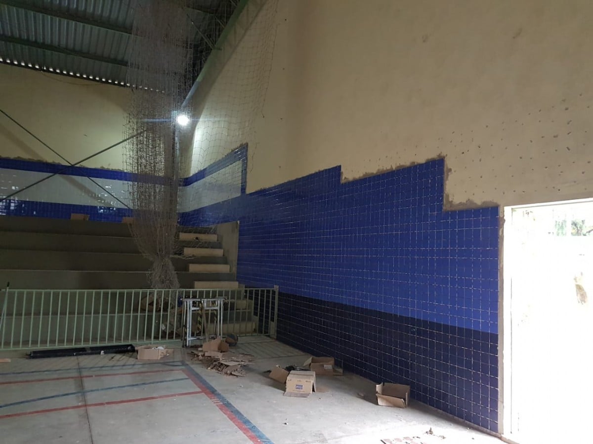 As paredes do ambiente receberam revestimento em pastilhas, o piso da quadra foi restaurado com resina líquida e as arquibancadas foram pintadas. Visando reduzir a temperatura interna, foram instalados ecobrisas e para a pintura do telhado optou-se por uma tinta específica que reflete o calor do sol.