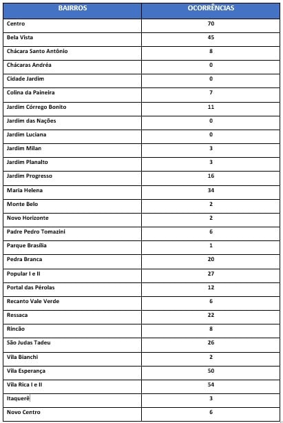 Além do levantamento das ocorrências e ações da Polícia, também foi emitido a relação de ocorrências por bairros da cidade. O Centro apresentou maior frequência com 70 registros, seguido pelo Vila Rica I e II com 54, Vila Esperança com 50 e Bela Vista com 45 ocorrência em 2018. Já os Chácaras Andréa, Cidade Jardim, Jardim das Nações e Jardim Luciana não registraram nenhum apoio policial durante 2018.