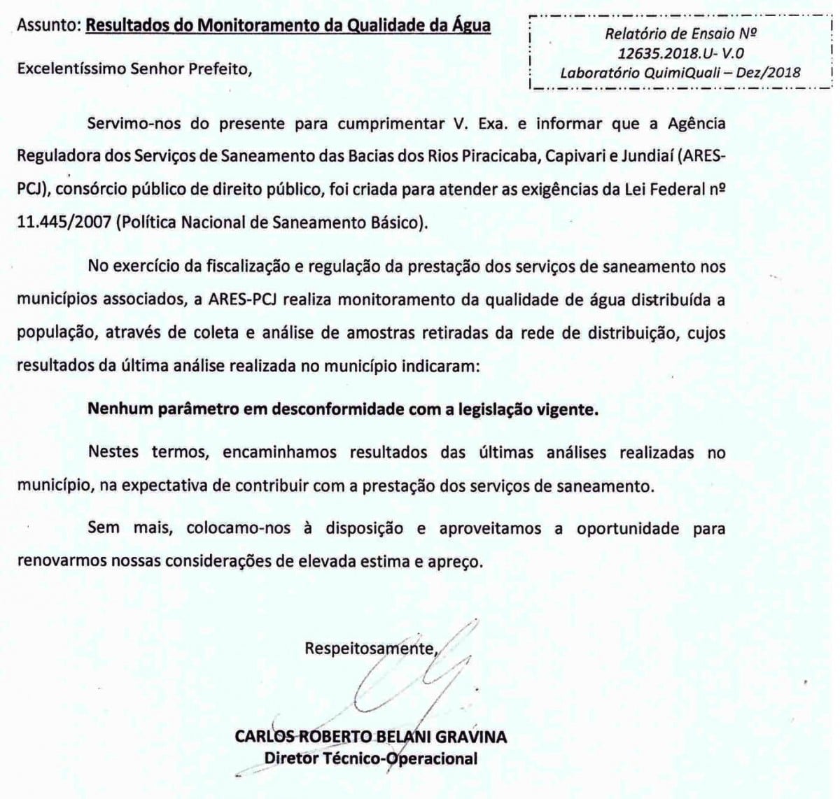 Novamente, o resultado ratifica o trabalho realizado pela equipe do DAE e garante o padrão e qualidade da água para consumo.